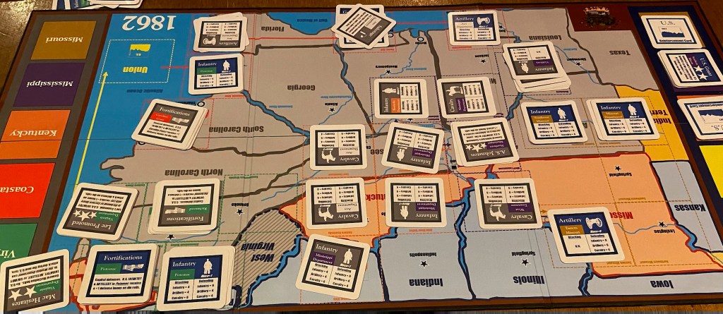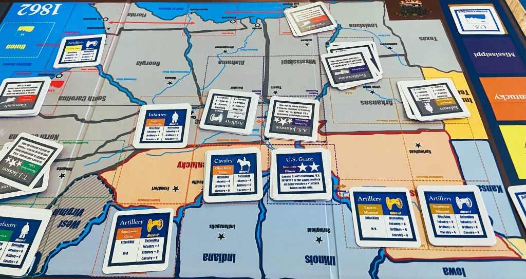 1862 is a historical strategy game that portrays the epic Civil War struggle between the North and South throughout 1862, a year where the scale of the conflict was first realized and the stage for the rest of the war was set. Players play cards for Union (U.S.) and Confederate (C.S.A.) forces, trying to occupy the most territory by the end of the game.