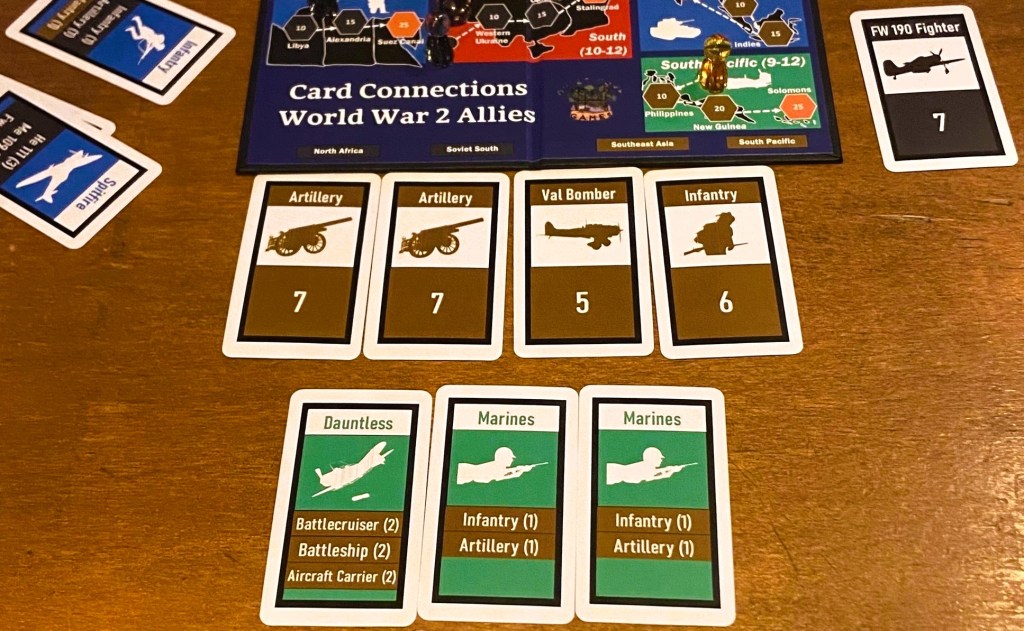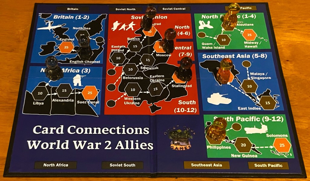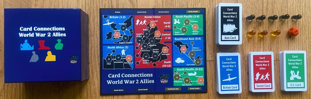 Card Connections: World War 2 Allies is a 3-player cooperative historical strategy game based on the early years of World War 2, from the fall of France in 1940 to the first months of 1943, when the Allies successfully halted the Axis advances. Players work together as a team, drawing cards for the major Allies, Great Britain, the Soviet Union, and the United States, deciding which ones to keep and play against the Axis. Will the Allies stop the advancing Axis powers?