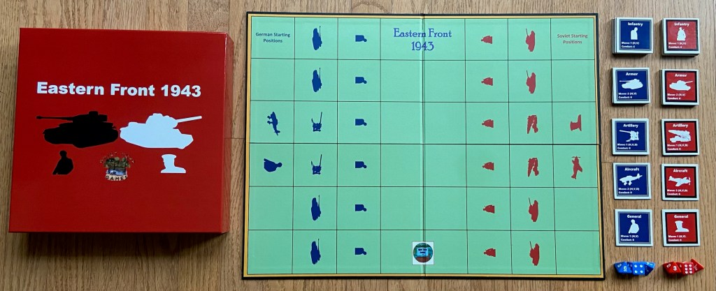 Eastern Front 1943 is a historical strategy game based on units that fought the Eastern Front during World War 2. The game features German and Soviet forces battling in the Soviet Union during 1943, a turning point for the war in the East. Players move and engage in combat with infantry, armor, artillery, and aircraft, with the goal of capturing the opposing general. Die rolls based on unit strengths are used to resolve battles.