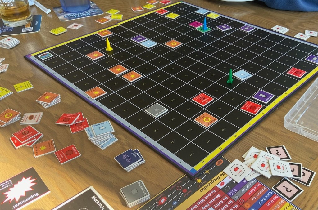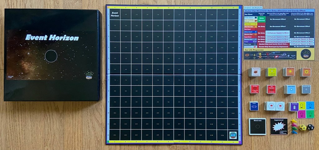Event Horizon is a cooperative astronomy game based on the life cycles of stars. The game focuses on the progression of stars during their lives and includes actual star phases, such as nebulae, proto-stars, red giants and white dwarfs. Players work together to guide their rocket ships in dodging supernovas, evading black holes, and escaping to safety through their designated wormholes. It plays like an escape room in space! Simple and fun to play, Event Horizon challenges players to develop a cooperative strategy to defy the unpredictability of the universe and win as a team. And no two games of Event Horizon are ever the same!