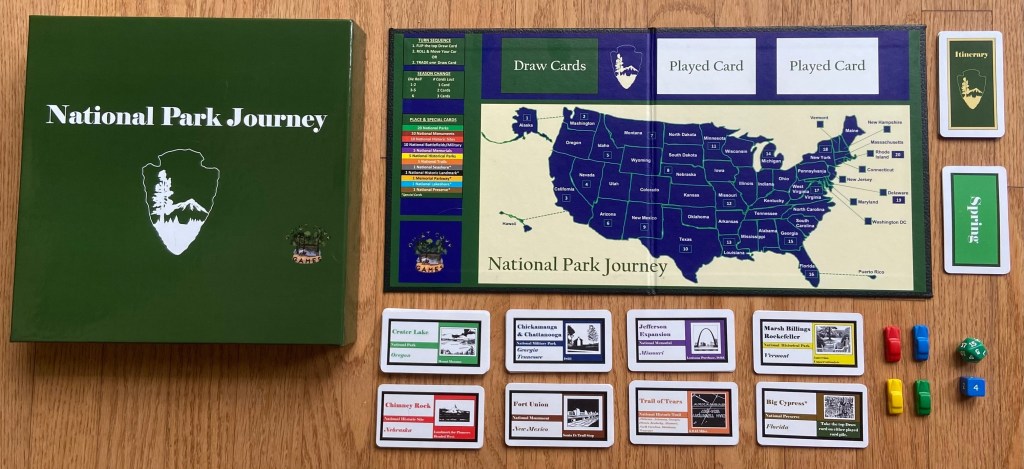 National Park Journey is a cooperative game where players travel across the U.S. and complete itineraries based on 70 places administered by the U.S. National Park Service as of 2023. The team wins or loses based on all players completing their itineraries. National Park Journey includes National Parks, Monuments, Historic Sites, Memorials, Trails, & more. The game is fast, fun, easy to play, and is a great introduction to some of the amazing National Park locations in the United States.