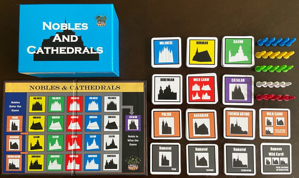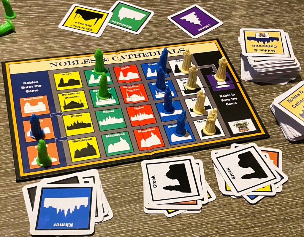 Nobles & Cathedrals is a fun strategy game for all ages that features cathedrals and other religious buildings around the world. Cards are drawn and played in order to populate cathedrals with nobles and win. Our second most popular game, it plays simple, fast, & fun and it travels easily in a small custom-printed box.