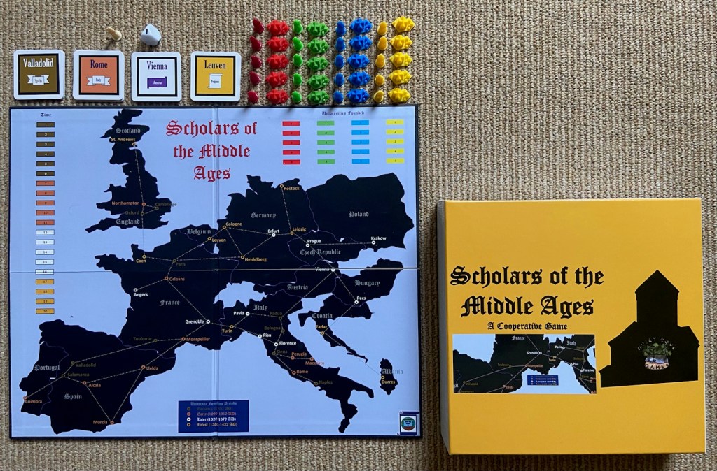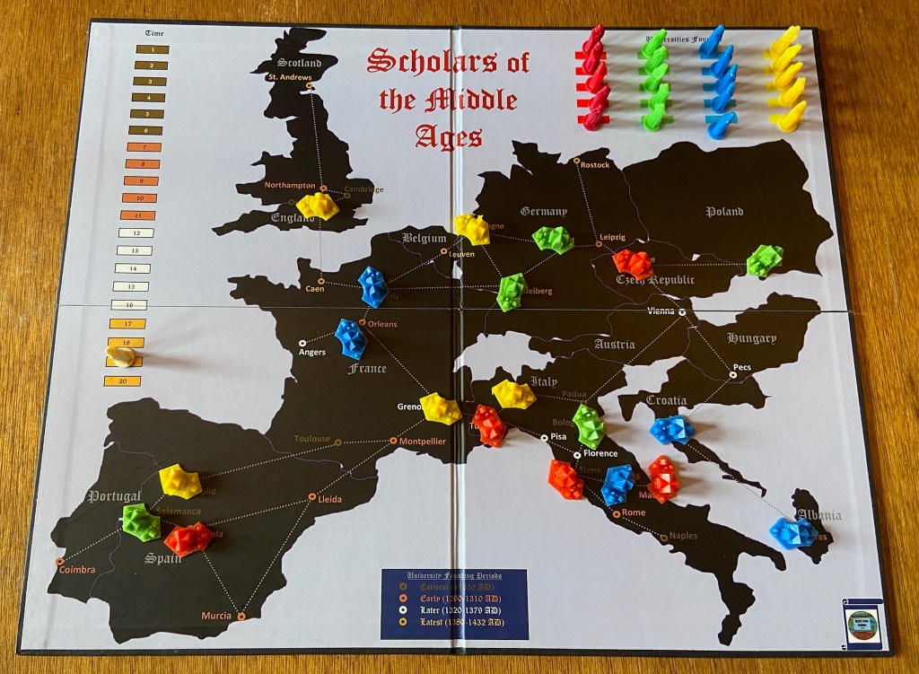 Scholars of the Middle Ages is a cooperative multi-player game where players work together against time (and plague!) to establish the first universities in Europe. Players must collaborate and use their scholars to found universities in four different time periods during the Middle Ages, ranging from the early 1200’s and before to the early 1400’s AD. Scholars of the Middle Ages is a great introduction to European geography and to the early days of the Western university system as we know it today.