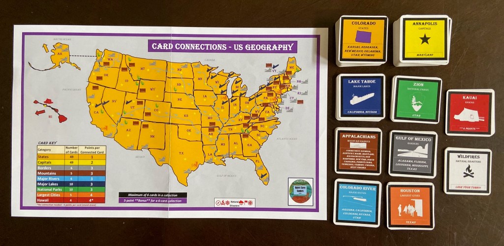 Card Connections: US Geography is a card game that can help provide answers to these questions and many more. Players collect cards and try to match them with other cards, creating connections and collections to gain points, totaled at the end to determine the winner. Card Connections: US Geography is an easy way to learn about the U.S. states, their borders and capitals, and their features.