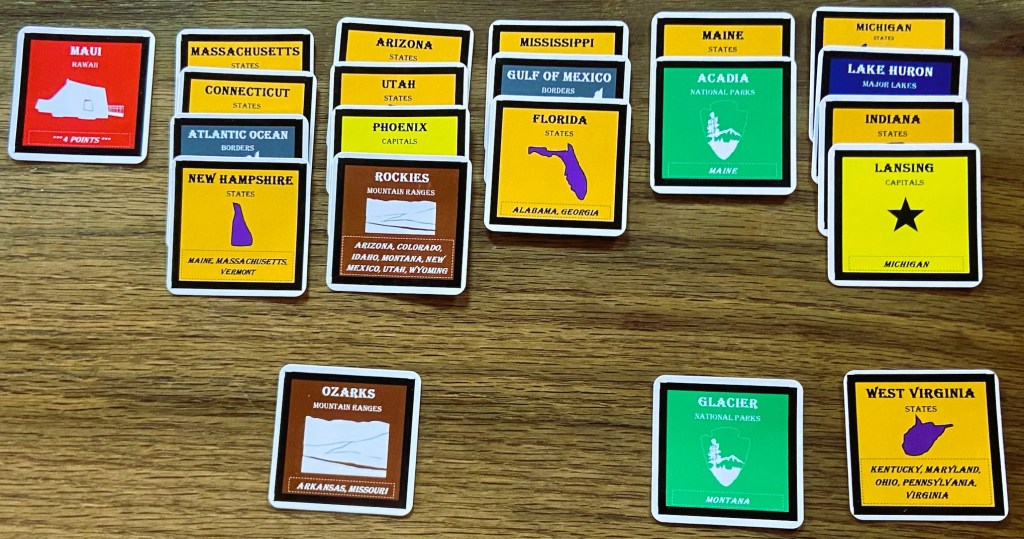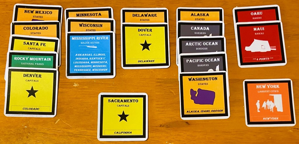 The game contains 150 custom printed cards in 10 different categories, a reference map of the United States, and comes in a professionally printed glossy game box.